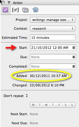 The Omnifocus inspector still shows when I added this task. Deferring the start date is preferable to clogging up your task list with ‘active’ tasks for which you have no time and with aspirational due dates, which then have to be managed.