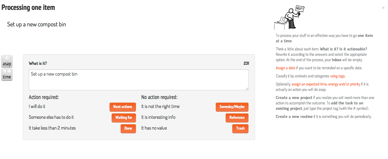 In true GTD spirit, the Facile Things inbox serves as a repository for all thoughts, ideas and tasks that cross your mind in the course of the day. Collect it all in your ‘trusted sytem’ until you have time to review your catch.