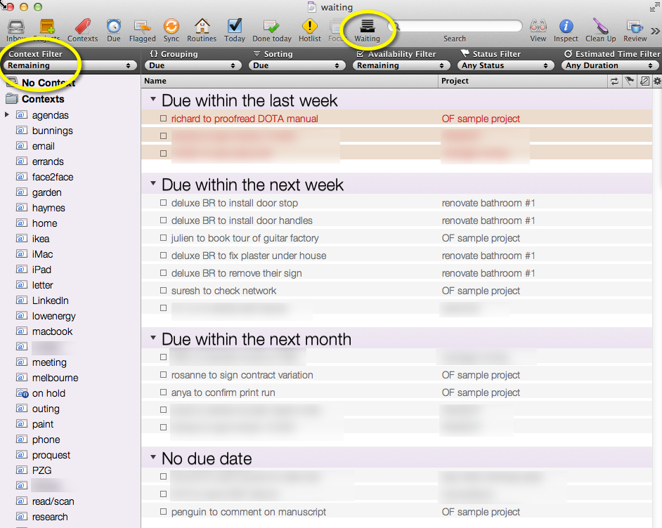 When I started using Omnifocus I felt frustrated that ‘waiting’ did not appear to show up in the context view. I had entered several tasks that were waiting to be completed by somebody else, so where were they? The penny finally dropped: the app’s default filter was set to ‘active’ contexts — and quite rightly did not display tasks that were outside my control. Changing the filter to ‘remaining’ made all contexts visible, including ‘waiting’.