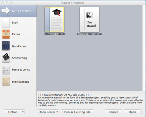 When you first fire up scrivener you see a rather modest looking workspace in which a tutorial and an extensive manual figure prominently. The navigation pane on the left offers templates for fiction and non-fiction, scriptwriting, poetry and lyrics.